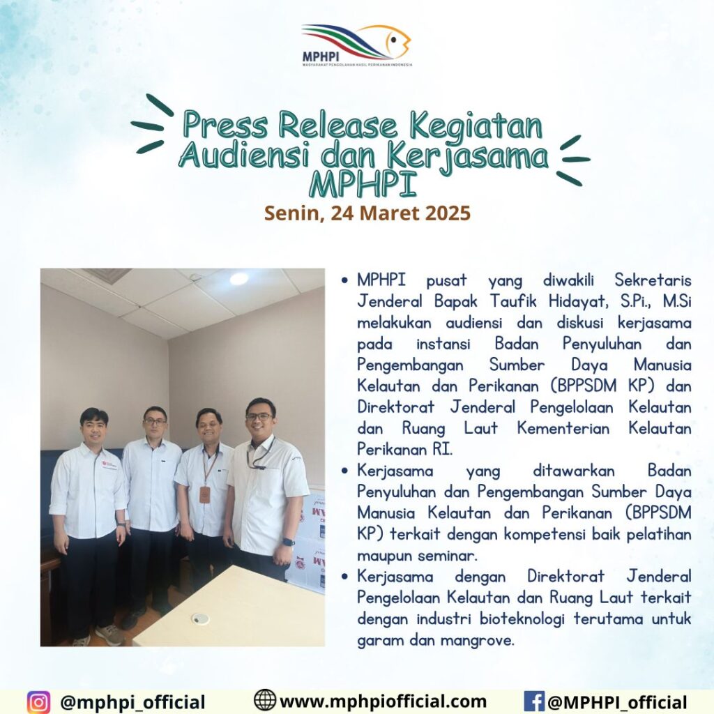 *Press Release Kegiatan Audiensi dan Kunjungan Kerjasama MPHPI* Jakarta, 24 Maret 2025 MPHPI pusat yang diwakili Sekretaris Jenderal Bapak Taufik Hidayat, S.Pi., M.Si melakukan audiensi dan diskusi kerjasama pada instansi Badan Penyuluhan dan Pengembangan Sumber Daya Manusia Kelautan dan Perikanan (BPPSDM KP) dan Direktorat Jenderal Pengelolaan Kelautan dan Ruang Laut Kementerian Kelautan Perikanan RI. Kerjasama […]