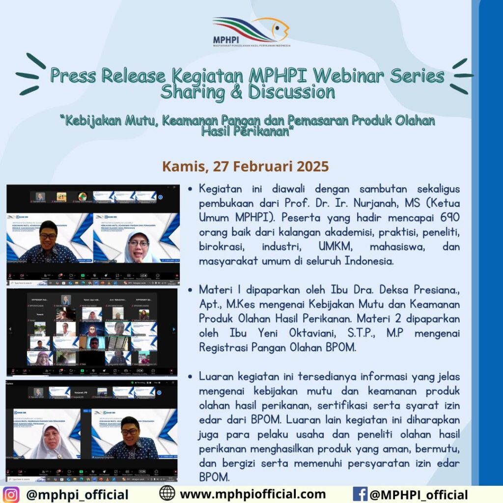 Press Release Pelaksanaan Kegiatan MPHPI Webinar Series Sharing & Discussion Judul : Kebijakan Mutu, Keamanan Pangan dan Pemasaran Produk Olahan Hasil Perikanan Online Zoom Meeting, 27 Februari 2025 1. Kegiatan ini diawali dengan sambutan sekaligus pembukaan dari Prof. Dr. Ir. Nurjanah, MS (Ketua Umum MPHPI). Peserta yang hadir mencapai 690 orang baik dari kalangan akademisi, […]
